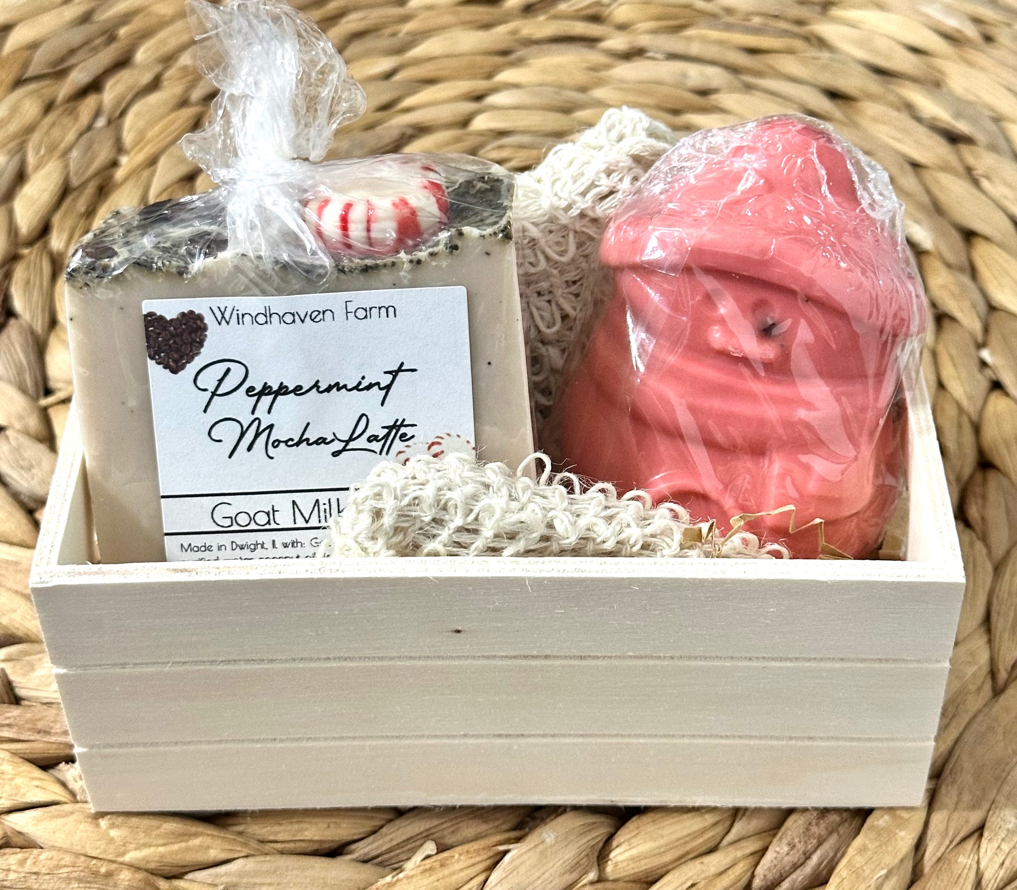 These adorable soap crates make gift giving easy when you let us do all the work! Each crate comes with your choice of soap, a Sisal Exfoliate Soap Bag, a small holiday themed soap, a wooden crate, & crinkle filler. Each crate will have cellophane over the top to secure items.