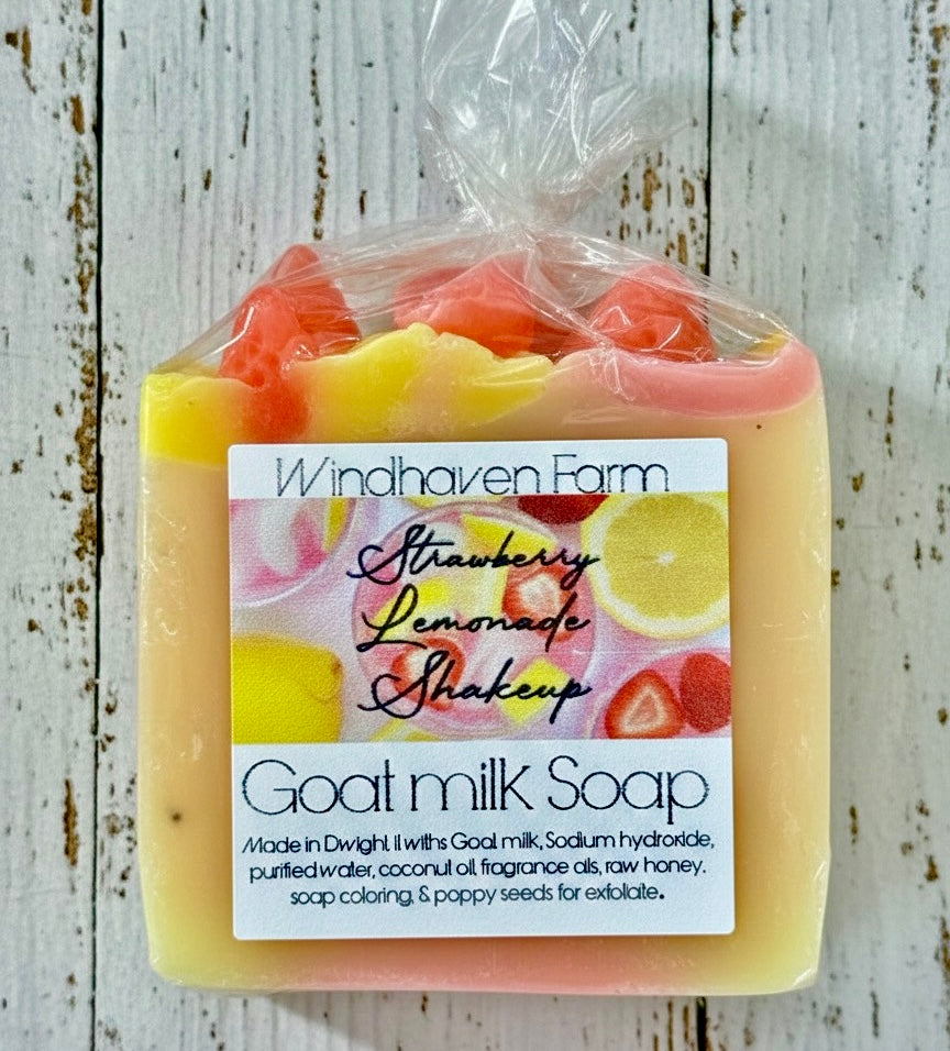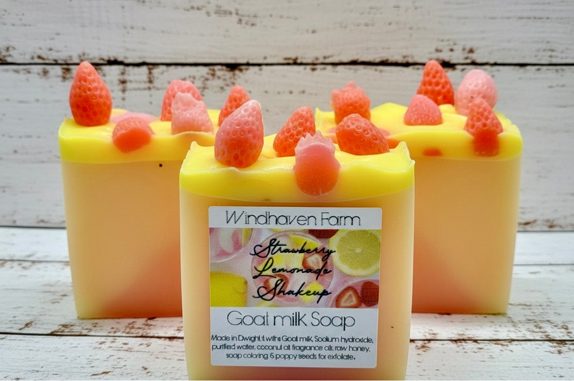 Our homemade goat milk soap: Made with Goat milk, Sodium hydroxide, purified water, coconut oil, Strawberry & Lemon fragrance oils, mica powder, raw honey, & poppy seeds for an exfoliate.